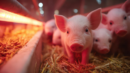 A close-up view of playful piglets in a barn setting, showcasing their cute features and warm expressions against a softened background. Perfect for agriculture themes.
