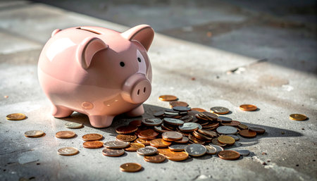 This charming image features a pink piggy bank lying next to scattered coins, set against a vibrant graffiti wall that adds an urban flair.