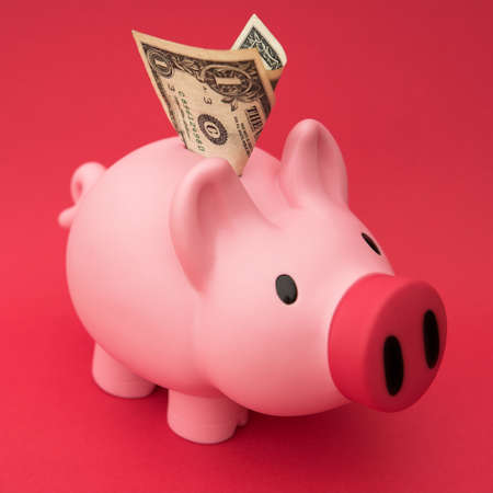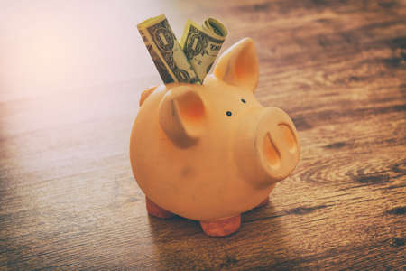 A piggy bank,dollar bills and a blur alarm clock on out of focus background. Saving money, economy and finance concepts.