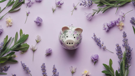 A decorative piggy bank sits elegantly amidst a vibrant floral arrangement, featuring lavender and delicate flowers on a soft purple background, inspiring savings and beauty.