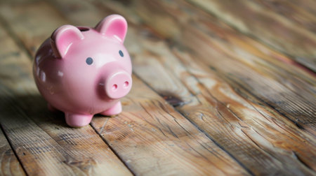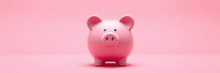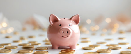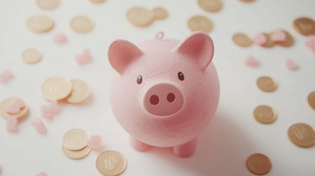 A charming pink piggy bank sits on a bright white background surrounded by shiny gold coins, symbolizing savings, finance, and financial planning for all ages.
