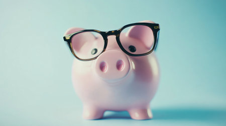 Piggy bank wearing glasses on light blue background, humorous financial concept