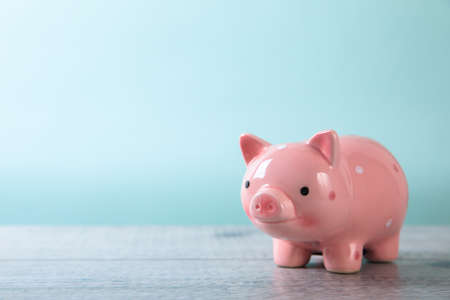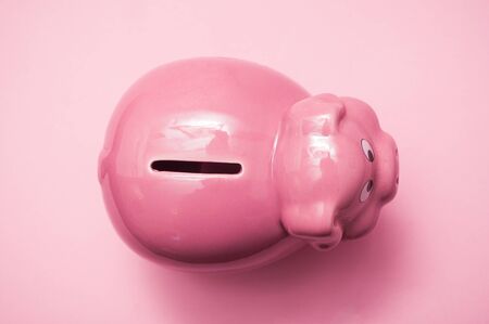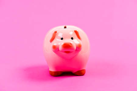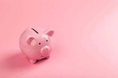 Money saving and investment concept. Piggy bank on pink background with copy space