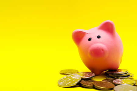 Pink piggy Bank on a yellow background stands on coins, loses balance, front view. The concept of savings, financial management.