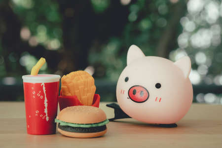 Toy fast food food and drink with toy pink on wood table. Concept of unhealthy food