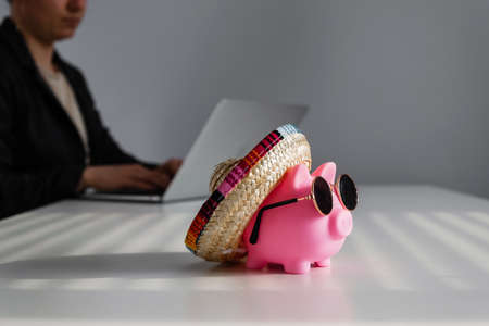 Piggy bank in sunglasses and a sombrero in the background woman works for a laptop