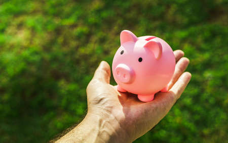 pink piggy bank on a green background. Concept of saving money or savings, investment.