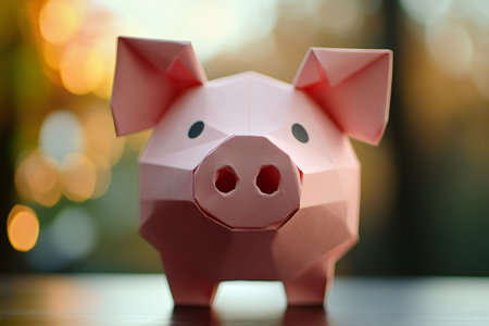Pink origami pig standing on a table, representing savings, arts and crafts, or the concept of investment