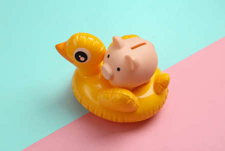 Inflatable duck with piggy bank on pink blue background. Minimal summer concept.