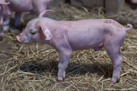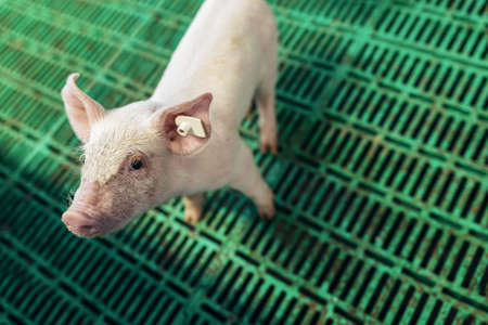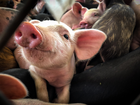 Pink skin of small piglet waiting feed on the farm. Happy pigs on a pig farm in swine business in tidy and clean indoor housing farm, Livestock breeding. Group of pigs in a farmyard, Swine at the farm