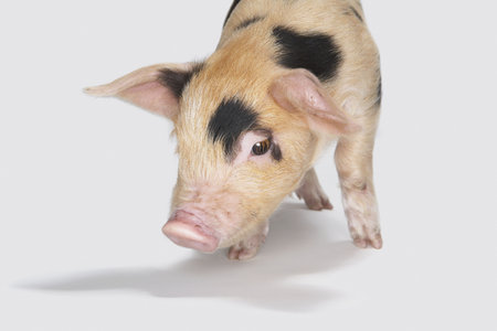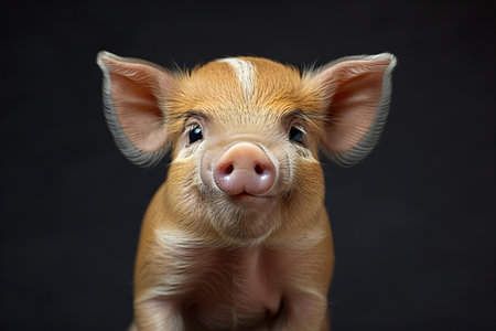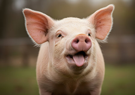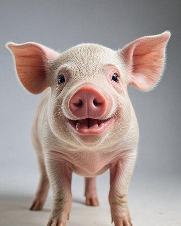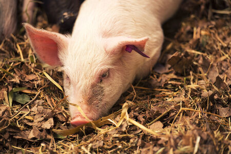 young happy baby pig with ear tag on a farm smiling towards the camera