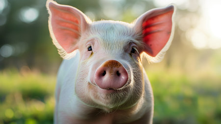 A farm pig stands in a lush green pasture surrounded by vibrant grass and trees The sun shines brightly as the pig snorts and looks around enjoying its day outdoors.