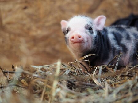 Piebald mini pig of the Vietnamese breed on hay background. Animal and agriculture concepts.