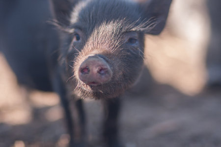 Cute little black piggy, portrait of mini pig. A little piggy in the mud on a farm