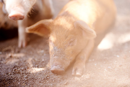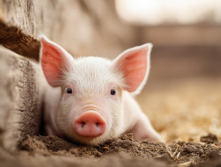 Cute young pig resting on straw bedding inside barn. Farm life and livestock care concept.