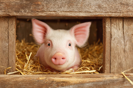 A charming piglet curious eyes shine through a weathered wooden frame, nestled amid golden straw in a warm, sunlit barn creating a heartwarming rural scene.