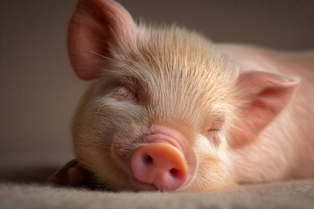 A tiny piglet curls up peacefully on plush fabric, its closed eyes and gentle fur highlighting a serene moment bathed in warming daylight.