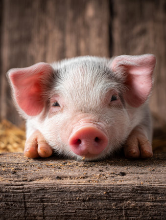A charming piglet lounges peacefully on weathered wood, basking in gentle daylight that enhances the cozy, rustic ambiance of the barn.