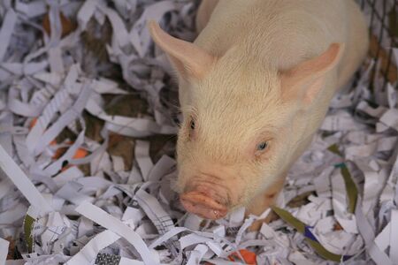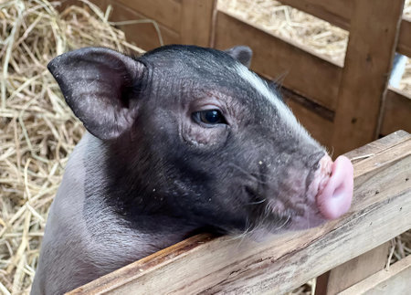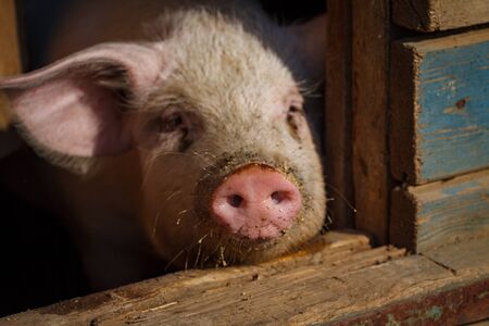 A piglet with a pink nose, a piglet peeps out of a house on a pig farm waiting for food for the holiday