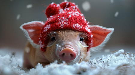 Cute little piglet in sweater and scarf near fireplace on Christmas eve