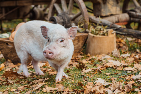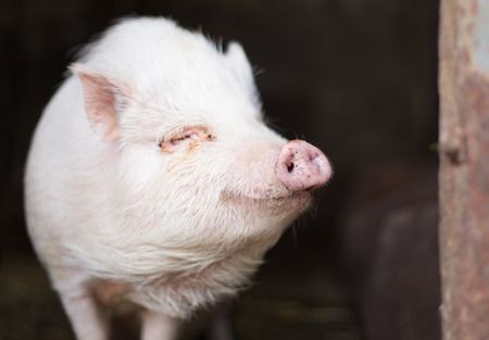 Portrait of a cute little pig in a pigsty. Farm animals.
