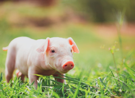 Close-up of a young piglet on a green field under a blue sky with clouds. Cute farm animal. Concept of livestock, agriculture, nature, countryside life, pink pig.