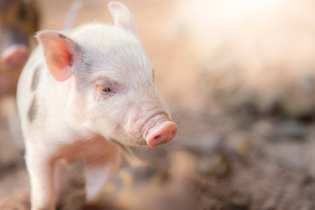 Close-up of a cute muddy piglet running around outdoors on the farm. Ideal image for organic farming