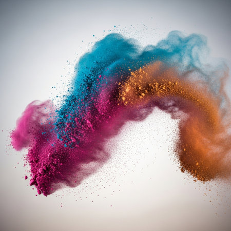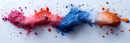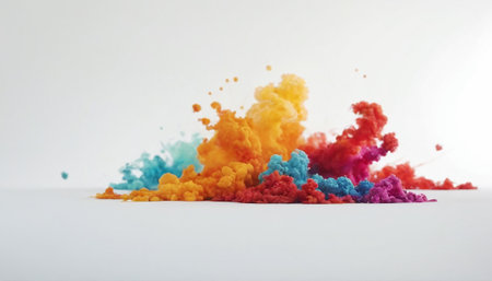 Colorful powder splashes create vibrant explosion of yellow, red, and blue hues against white background, evoking sense of creativity and energy