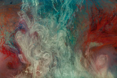 Fantastic colorful texture of ink stains in chaotic motion on white background. Abstract colorful rose, red paints flowing in white liquid substance.