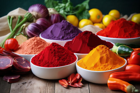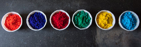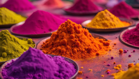 A collection of bowls filled with vibrant powders for the Holi festival in India. These colors symbolize the joy and celebration of the festival.