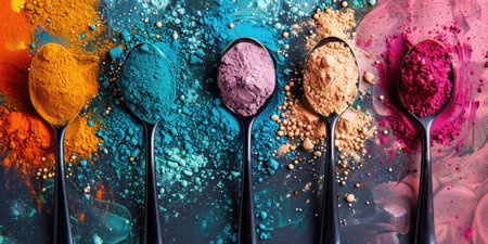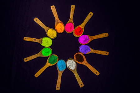 a row of colorful powder colors on wooden spoon in black background with copy space