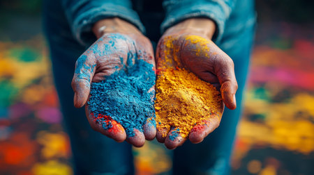 Close-Up of Hands Holding Vibrant Holi Powder on a Boat. Concept of Cultural Celebration, Colorful Traditions.