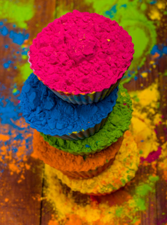 Holi color powder. Organic Gulal colours in bowl for Holi festival, Hindu tradition festive. Blue, pink, magenta, orange, yellow holi dry paints on wood desk background.