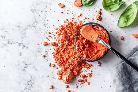 A captivating image showcasing vibrant orange spice powder spilled on a marble surface with fresh basil leaves. Perfect for culinary inspiration, this photo highlights the rich texture and color of spices.