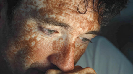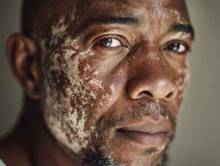 Close-up of a man's face, highlighting vitiligo patches on his skin, with visible texture and details. The man's expression is calm, showcasing unique pigmentation variation