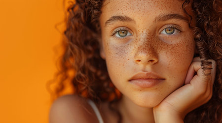 Vibrant Closeup Portrait of Young Girl with Freckles and Curly Hair on Orange Background
