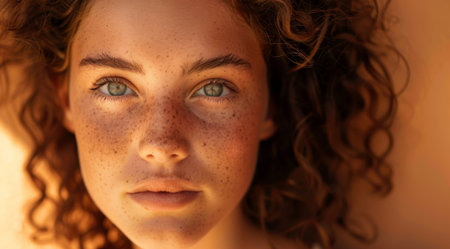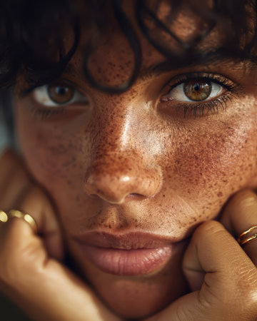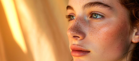 Close up portrait of woman with freckles, showcasing her natural beauty and glowing skin. soft lighting highlights her features, creating serene and intimate atmosphere