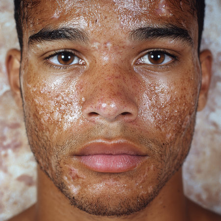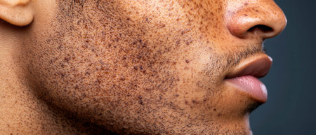 close up image of a young casual man with visible skin problems highlighting blemishes and texture. The photo focuses on the challenges of problematic skin, emphasizing the importance of skin