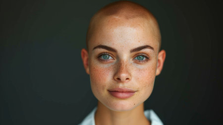 Close-up portrait of a young woman with bald head and freckles wearing a white shirt against a dark background, showing confidence and natural beauty.