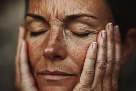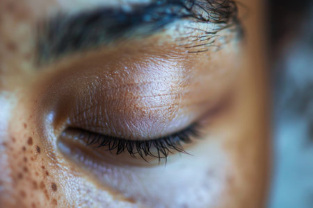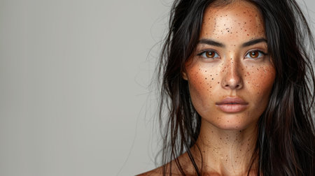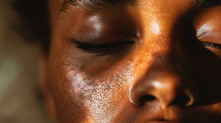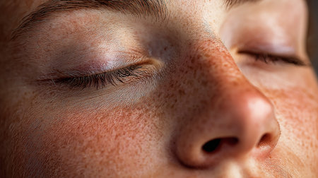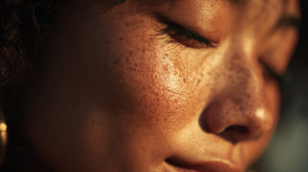 Detailed close up of freckles on multiracial woman s face with eyes shut using ai technology