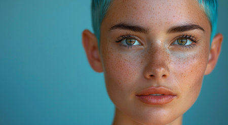 Young woman with short blue hair and beautiful eyes on blue background.AI Generative.