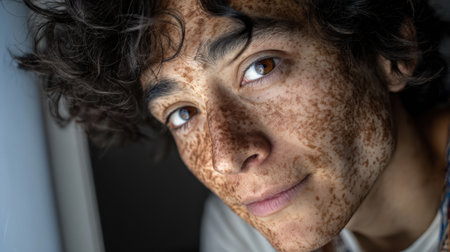 Young man with curly hair and freckles is gazing thoughtfully at the camera, showcasing a warm and inviting expression in soft lighting.