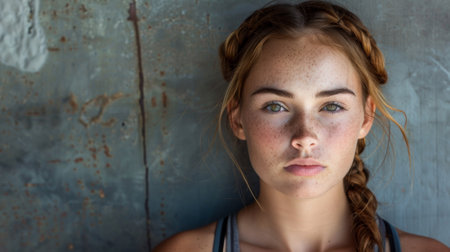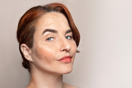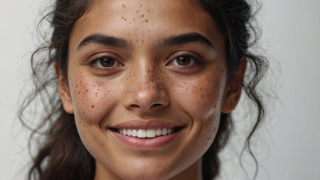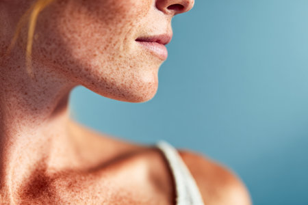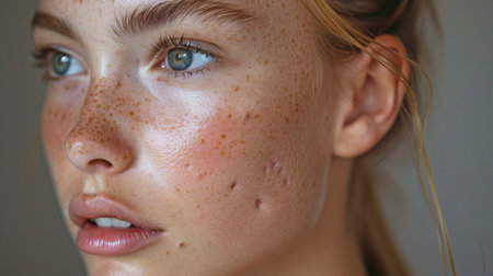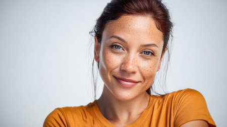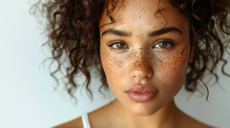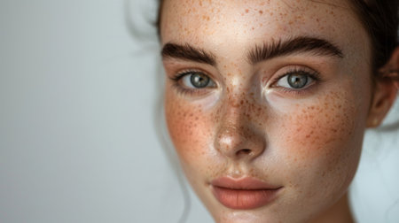 Clean and Fresh: A Close-up Portrait of a Young Woman with Freckles, showcasing Natural Beauty and Healthy Skin in a Studio Shot