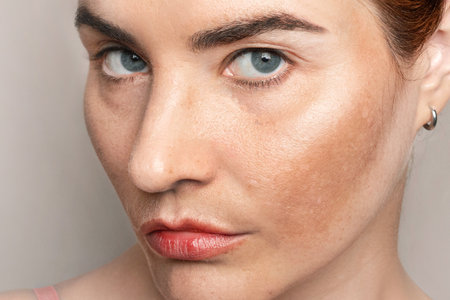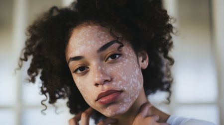 Portrait of young casual woman with vitiligo condition looking at camera close up