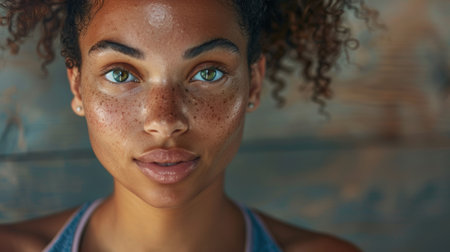 A close-up portrait of a woman in a gym outfit, highlighting natural beauty and body confidence, focusing on real skin textures and the natural shape of the body