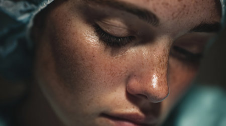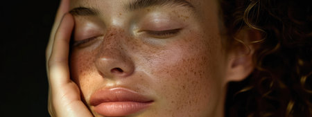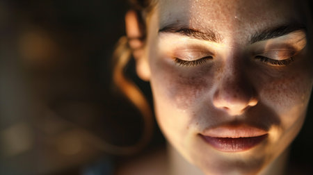 This close-up portrait captures a young woman's serene expression, highlighting her freckles and natural beauty in soft lighting. Ideal for promoting confidence and self-acceptance.