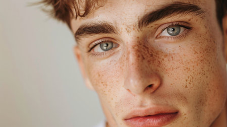 This close-up portrait showcases a man with striking freckles and a serious gaze, revealing intricate details of his skin texture and unique charm.