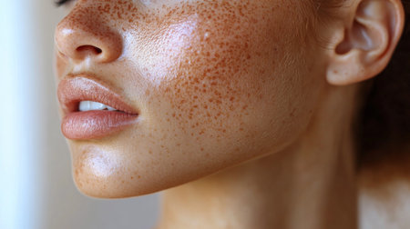 A close-up view of a womans freckled face showcasing natural beauty and healthy skin during daylight hours. Generative AI