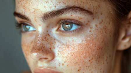 A close-up of a woman with a sprinkle of freckles on her face, highlighting her unique features and natural beauty.