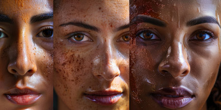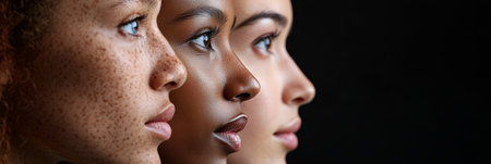 Close-up side profile of three diverse women with different skin tones. Concept of unity, beauty, and diversity.
